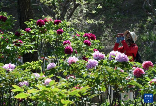 4月20日,游客在圆明园拍摄盛开的牡丹。